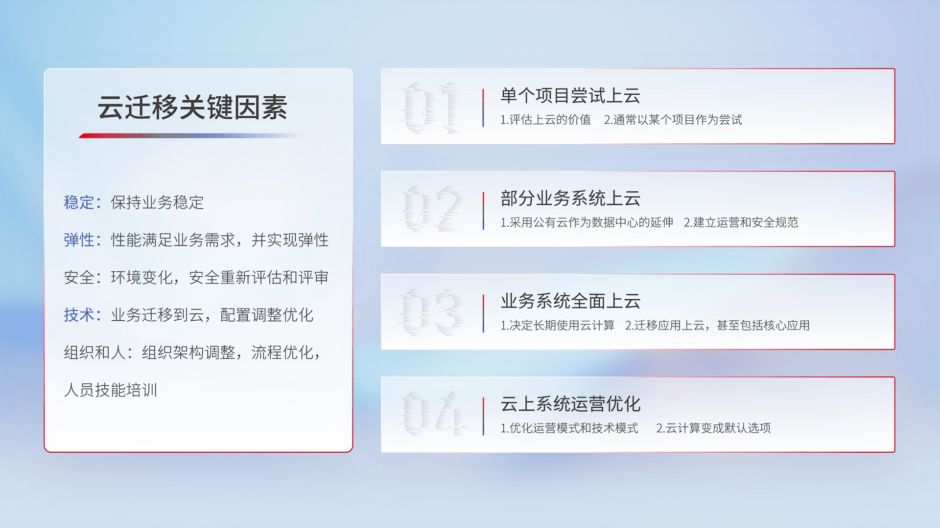 结合实际业务,,从规划设计、、、、云平台选型、、、、云原生改造、、、、数据迁移、、、集成交付,,,,迁移全过程为客户识别最佳上云路径,,做好风险识别管理,,,,设计网络架构、、、身份权限、、、、安全审计合规、、、、操作审计、、、日志审计、、、监控告警策略、、、多站点容灾设计等,,,,对云上基础设施进行整体规划,,,提升IT治理水平,,,以满足弹性、、、、高可用、、、、高性能的需求。。