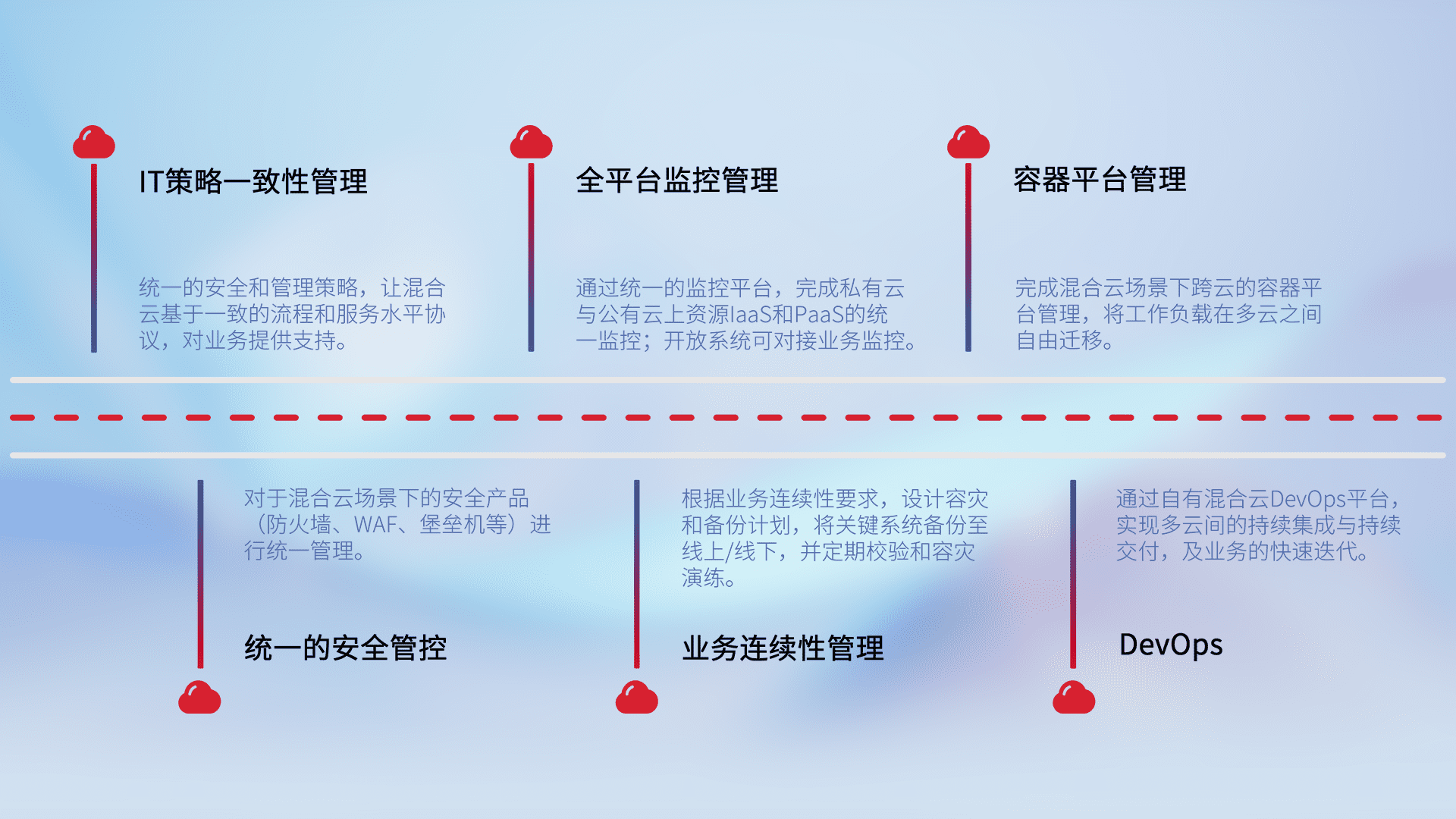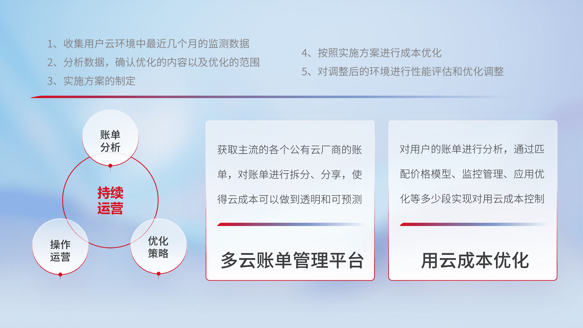 通过多云纳管,,,,以统一的资源数据模型把客户的云资源进行抽象和封装,,,,进而实现对多云资源的统一操作,,,保障云资源管理的可靠性、、、、稳定性与可用性。。。量身定制化运维内容,,配置、、、开发运维、、、、补丁管理、、、、备份、、、监控、、、认证和访问管理、、审计和日常巡检等,,,,保障在用云过程中的可靠度,,稳定度以及高可用率。。